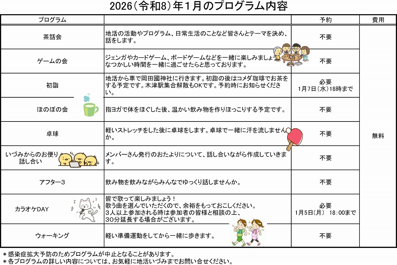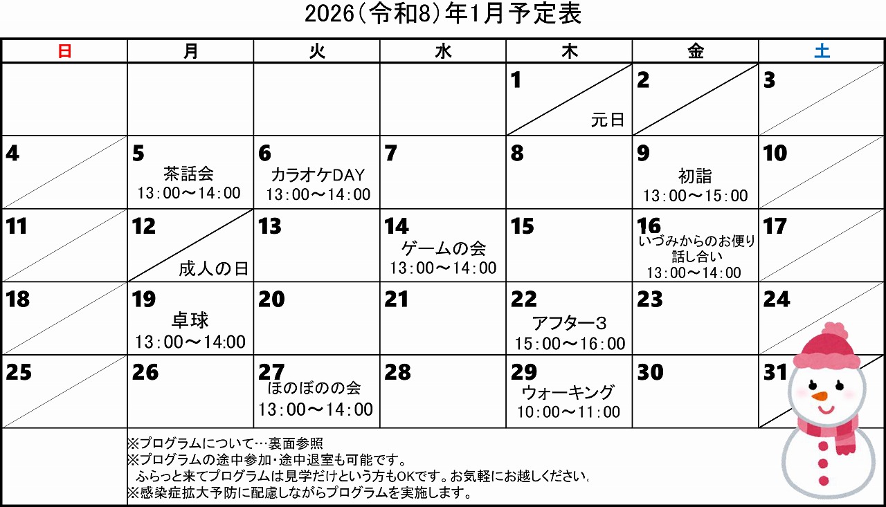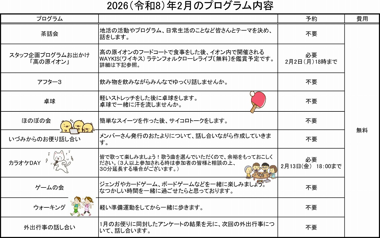 - 茶話会、カラオケ、卓球、外出行事、スタッフ企画プログラム、当事者活動などのプログラムを実施しています。(一部の行事の費用には自己負担が発生します。)