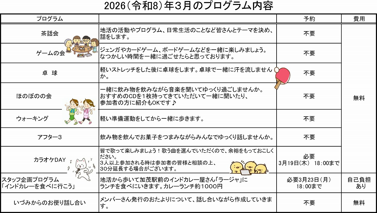 - 茶話会、カラオケ、卓球、外出行事、スタッフ企画プログラム、当事者活動などのプログラムを実施しています。(一部の行事の費用には自己負担が発生します。)