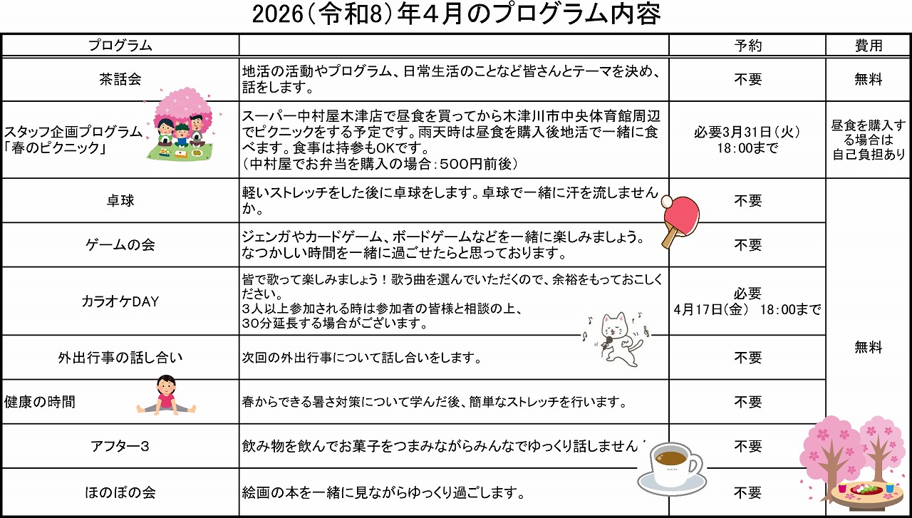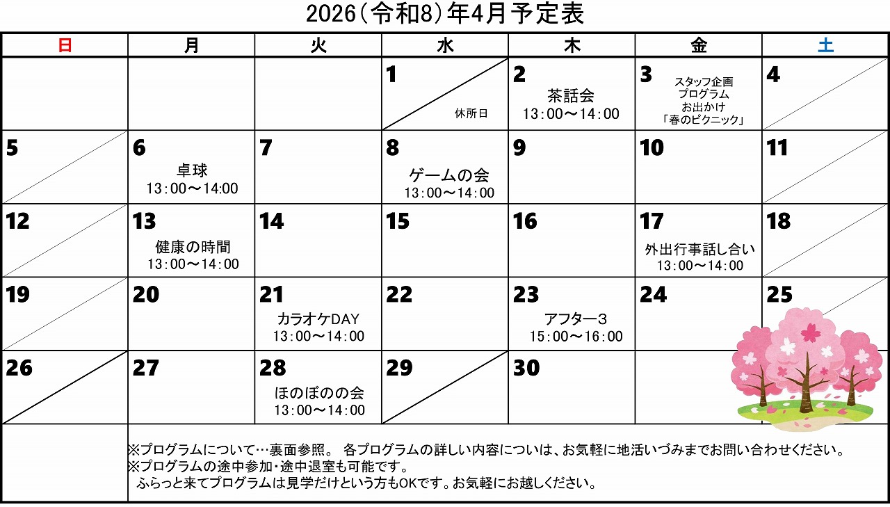 - 茶話会、カラオケ、卓球、外出行事、スタッフ企画プログラム、当事者活動などのプログラムを実施しています。(一部の行事の費用には自己負担が発生します。)